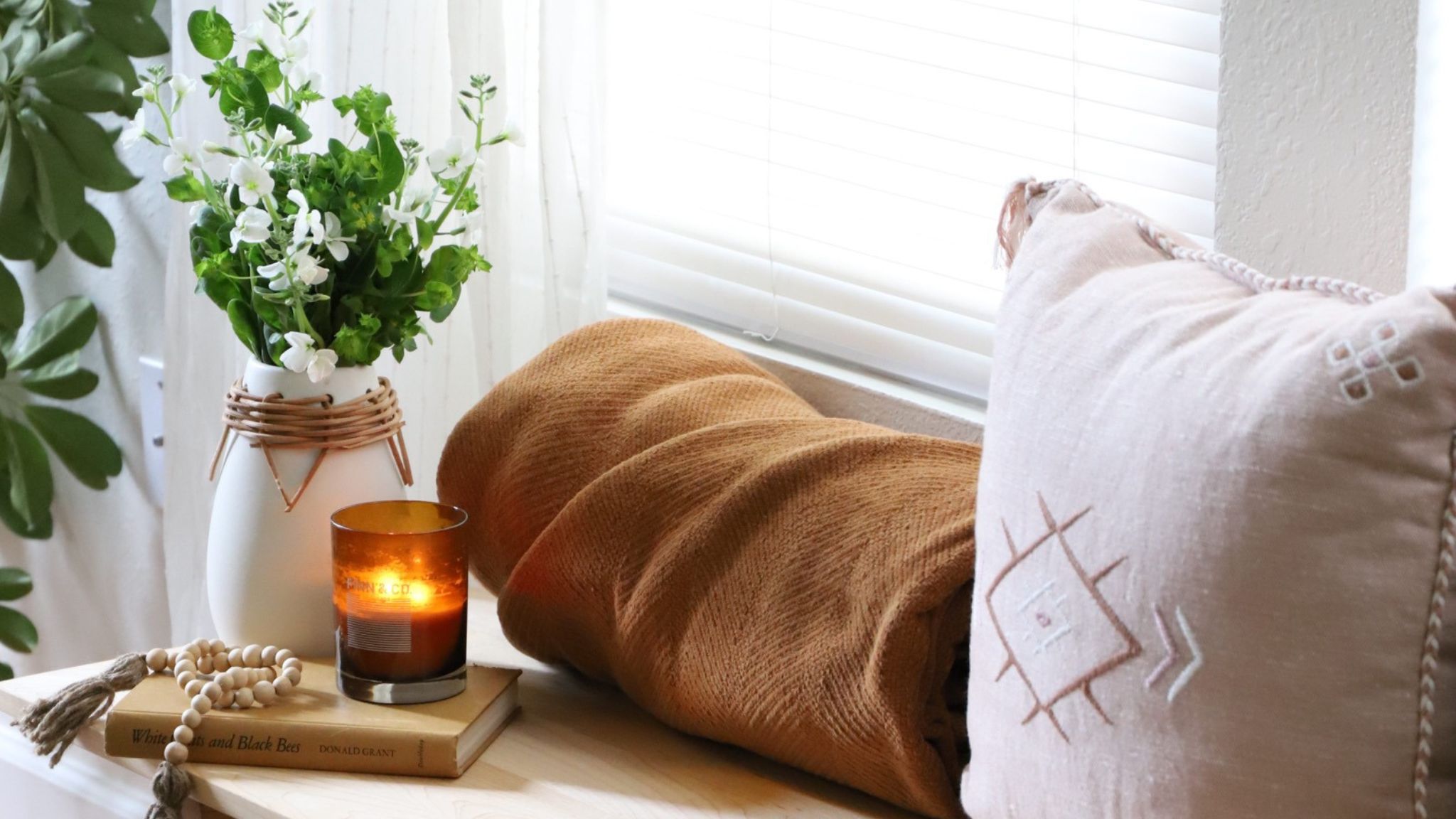 - Large Candle: A luxurious candle (or a few small ones) is an excellent way to dress up your coffee table, though we always recommend choosing a natural candle, such as a beeswax candle that won’t cause toxic chemicals to off-gas into your home.